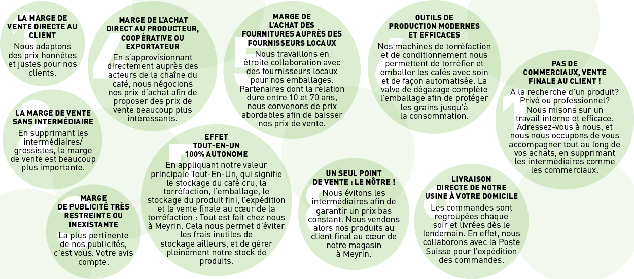 Chez les Cafés Trottet, la maîtrise des coûts des matières est primordiale pour assurer un prix de vente final très bas. Les cafés verts sont achetés 100% naturels auprès des coopératives, producteurs ou exportateurs. Pour varier nos gammes, nous cherchons à proposer des produits standards, biologiques ou de grande spécialité. En travaillant directement avec les partenaires, nous évitons les coûts supplémentaires de travail intermédiaire. L’unique coût de revient à notre charge est la main d’œuvre lorsque le produit nous parvient à Meyrin. Nous gérons ainsi le stockage à 7m sous terre, la torréfaction, le conditionnement et l’expédition finale.