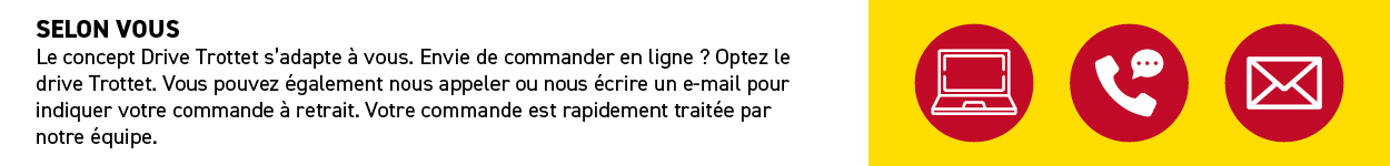 Au Trottet Drive, retirez gratuitement votre commande sur le parking Drive dès confirmation d’achat, sans sortit de votre voiture.
